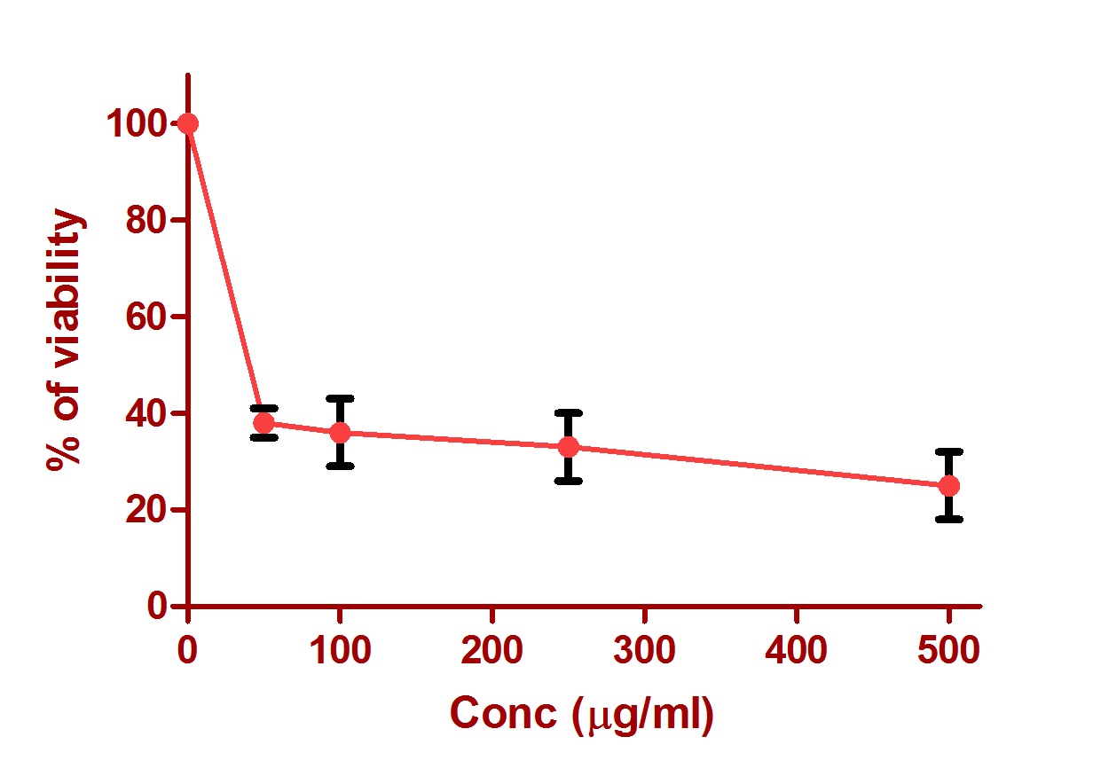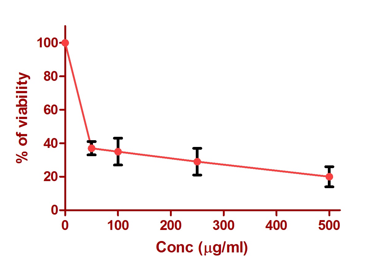 Fig. 1: Cytotoxic activity of A. vera extract in MCF-7 cell lines. Extract were incubated with 105 viable cells at concentrations ranging from 0 to 500 μg/ml for 48 h. Cell viability was determined by the MTT method
