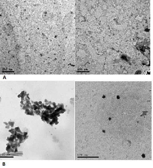 Fig. 1: TEM characterization of nanoparticles. (A) Shows size and shape of curcumin (30±5 nm), and (B) Shows size and shape of chitosan (20±5 nm)