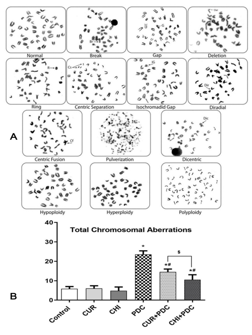 Fig. 2: Chromosomal aberration test. (A) Normal metaphase and different structural and numerical chromosomal aberrations in mice bone marrow from metaphases of treated groups. (B) Number of total chromosomal aberrations in the control and treated groups (n=6). Data are expressed as mean±SD Statistical analysis was performed for statistical changes between the selected groups: *P ≤ 0.05 indicates statistical difference from the vehicle-treated (control) group, #P ≤ 0.05 indicates statistical difference from the PDC-treated group, and $P ≤ 0.05 indicates statistical difference between CHI+PDC and CUR+PDC groups in one-way ANOVA test with Tukey's multiple comparisons test. Abbreviations: CUR, rats treated with nanocurcumin; CHI, rats treated with nanochitosan; PDC, rats treated with potassium dichromate; CUR-PDC, rats treated nanocurcumin before potassium dichromate and; CHI-PDC, rats treated with nanochitosan before potassium dichromate