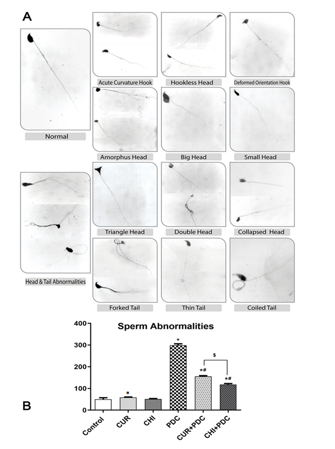 Fig. 3: Sperm morphology (A) Normal spermatozoa and different abnormalities in head, tail, or head and tail from treated groups. (B) Number of total abnormalities in the control and treated groups (n=6). Data are expressed as mean±SD Statistical analysis was performed for statistical changes between the selected groups: *P ≤ 0.05 indicates statistical difference from the vehicle-treated (control) group, #P ≤ 0.05 indicates the statistical difference from the PDC-treated group, and $P ≤ 0.05 indicates statistical difference between CHI+PDC and CUR+PDC groups in one-way ANOVA test with Tukey's multiple comparisons test