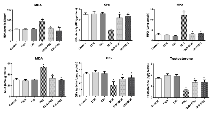 Fig. 4: Effects of nano CUR or nano CHI either alone or combined with PDC on the measured oxidative stress parameters [MDA level, GPx activity, and MPO activity] in the kidney of mice (upper raw), and the mice testicular MDA content, GPx activity, and testosterone level (lower raw). Data are expressed as mean±SD based on data from independent experiments performed in triplicate. *P ≤ 0.05 indicates statistical difference from the vehicle-treated (control) group, and #P ≤ 0.05 indicates the statistical difference from the PDC-treated group in one-way ANOVA test with Tukey's multiple comparisons test