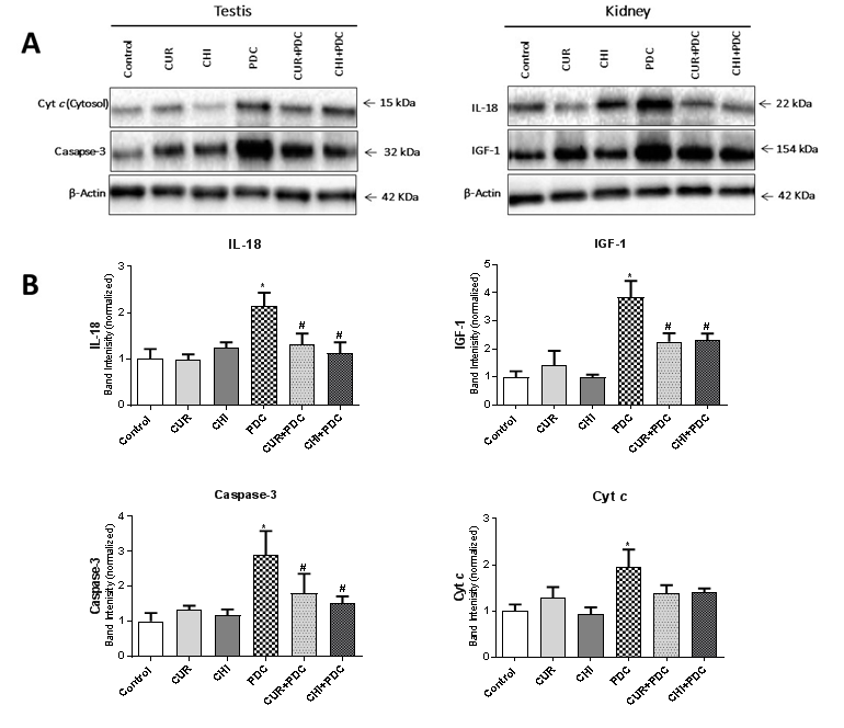 Fig. 5: Effects of nano CUR or nano CHI either alone or before PDC on testicular cytosolic cytochrome c (Cyt c) and caspase 3, and the renal interleukin-18 (IL-18) and insulin-like growth factor 1 (IGF-1) proteins. (A) Representative examples of a western blot images illustrating the cytosolic Cyt c and caspase 3 in the testicular homogenate of mice (left), and IL-18 and IGF-1 protein levels in total lysates samples from the kidney of mice (right). (B) Quantification of Cyt c and caspase 3 protein contents in the mice testis (upper), and IL-18 and IGF-1 protein levels in mice kidney (lower), with each normalized to the corresponding β-Actin bands. The specific protein of the control group is set to 1.0, and all band intensities are shown as mean±SD based on data from independent experiments performed in triplicate. *P ≤ 0.05 indicates statistical difference from the vehicle-treated (control) group and #P ≤ 0.05 indicates statistical difference from the PDC-treated group in one-way ANOVA test with Tukey's multiple comparisons test