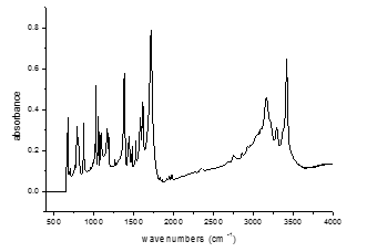 In the solid phase, Pyrazinamide has bands in the FTIR spectrum due to a primary amide N-H at 3413 cm-1, and an absorption band at 3162 cm-1due to N-H stretching (Symmetrical) [10]. FTIR spectra of unprocessed Pyrazinamide (fig. 1) show a band at 3411 cm-1 due to the primary amide and a band at 3160 cm-1 due to N-H stretching.
