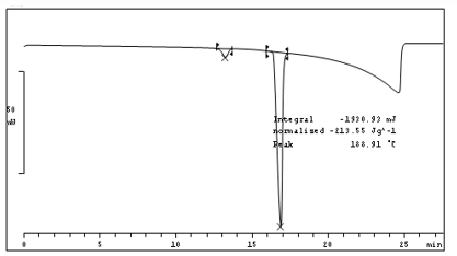 DSC scans shown in fig. 2 revealed that Pyrazinamide is crystalline in nature. A melting endotherm was visible on investigation of Pyrazinamide unprocessed material, which had an onset temperature at ~188°C and peaking at ~189 °C, which is in good agreement with the melting point reported in the literature at 188 °C to 191 °C [11].