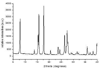 The crystallinity of Pyrazinamide was confirmed by XRD pattern as shown in fig. 3. The crystalline form of the sample was evident from the presence of peaks. It should be noted that powder X-ray difractograms of Pyrazinamide raw material was compared to the published crystal structures of different polymorphs of Pyrazinamide. The results obtained from the comparative study revealed that the unprocessed material was typical of a crystalline material. Moreover, the X-ray scans of Pyrazinamide were consistent with the XRD data presented by Takaki et al., [12] for alpha Pyrazinamide. Therefore, the starting material represents