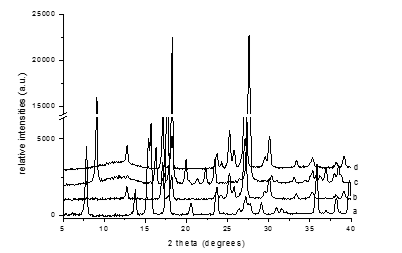 Fig. 4: XRD difractograms of Pyrazinamide (a) unprocessed and spray dried from (b) methanol/ water, (c) methanol/ butyl acetate (d) ethanol/ water