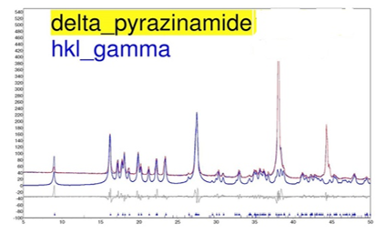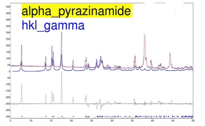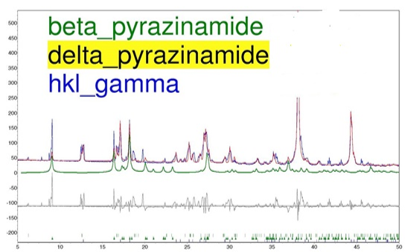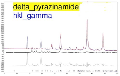 Pyrazinamide presents four polymorphic forms: alpha, beta, gamma and delta Pyrazinamide [12, 13, 14 and 15]. However, the pharmacopoeias do not specify any specific polymorph. Unfortunately, these articles do not display the powder pattern of the polymorphs; therefore, it is not possible to make a direct comparison with an experiment. As the structure of alpha, beta and delta are available; it was possible to generate theoretical XRD patterns of these forms and to compare with the experimental patterns. This has been done using the software TOPAS. However, as the structure of gamma-Pyrazinamide has not been published (atomic position inside the lattice are missing) the software could not generate the theoretical pattern of the gamma form and therefore a quantitative analysis was not possible. Nevertheless, it was possible to determine qualitatively the polymorphs present in our samples.
