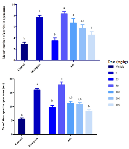 Fig. 1: Antianxiety activity profile of total-ash of H. sabdariffa calyces using EPM. The data is expressed as mean±SEM; *n=6; ap<0.001 vs control; bp<0.001 vs diazepam; one way ANOVA followed by Tukey’s multiple range tests