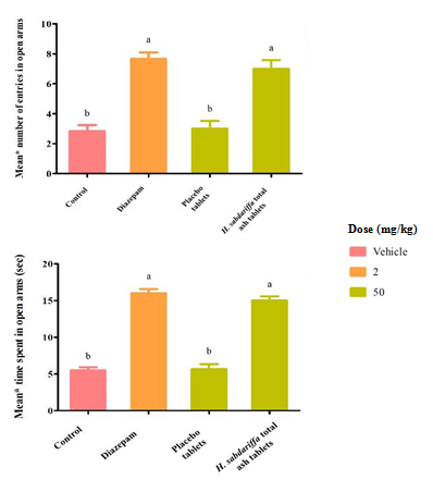 Fig. 2: Antianxiety activity profile of Placebo and H. sabdariffa total ash tablets using EPM. The data is expressed as mean±SEM; *n=6; ap<0.001 vs diazepam; bp<0.001 vs control; one way ANOVA followed by Tukey’s multiple range test