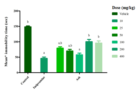 Fig. 3: Antidepressant activity profile of total ash of H. sabdariffa calyces using FST. The data is expressed as mean±SEM; *n=6; ap<0.001 vs control; bp<0.001 vs imipramine; one way ANOVA followed by Tukey’s multiple range test