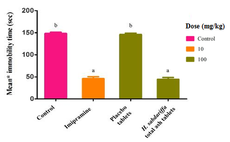 Fig. 4: Antidepressant activity profile of placebo and H. sabdariffa total ash tablet using FST. The data is expressed as mean±SEM; *n=6; ap<0.001 vs imipramine; bp<0.001 vs control; one way ANOVA followed by Tukey’s multiple range test