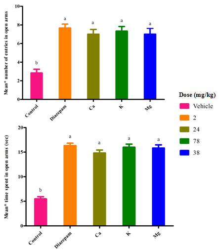 Fig. 5: Antianxiety activity profile of major elements present in the total ash of H. sabdariffa calyces, using EPM. The data is expressed as mean±SEM; *n=6; ap<0.001 vs diazepam; bp<0.001 vs control; one way ANOVA followed by Tukey’s multiple range test