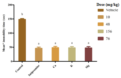 Fig. 6: Antidepressant activity profile of major elements present in the total ash of H. sabdariffa calyces, using FST. The data is expressed as mean±SEM; *n=6; ap<0.001 vs imipramine; bp<0.001 vs control; one way ANOVA followed by Tukey’s multiple range test