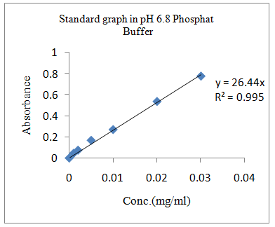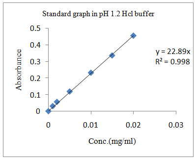 Ten tablets were finely powdered and an amount equivalent to 100 mg of Propranolol hydrochloride was accurately weighed and transferred to a 100 ml volumetric flask, then 70 ml of buffer pH 1.2 (0.01N HCl) was added. The flask was shaken for 10 minutes. Finally, the volume was made up to the mark with the same buffer solution. The resultant solution was then filtered through Whatman filter paper (No.41) and 1 ml of the filtrate was suitably diluted up to 100 ml with same buffer solution and analyzed for Propranolol hydrochloride content at 290 nm using a double beam UV/Visible spectrophotometer (Shimadzu 1800, Japan) and 0.01N Hcl as blank.