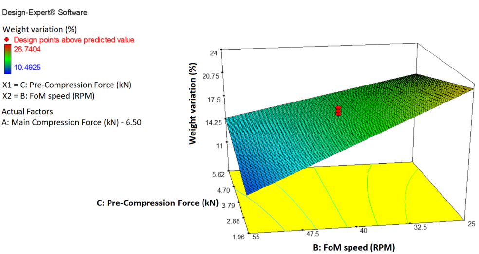 The model also indicated interactions between the Main Compression Force and Pre-Compression Force. When increasing the Main Compression Force, the Weight Variation increases when 5.615 kN of Pre-Compression force is applied. However, when the Pre-Compression force was 1.965 kN the opposite effect was observed.