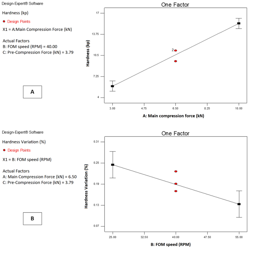 Fig. 2: Effects observed by changing the parameters of the main compression force and FOM speed, in hardness (A) and relative hardness variation (B)