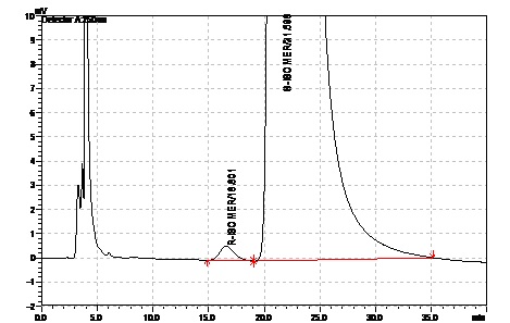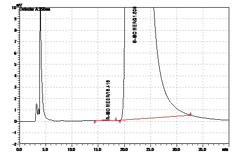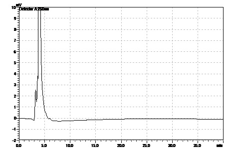 Due to the better chromatographic results obtained on the Chiralcel OD-H column, further method optimization andquantification of the (R)-enantiomer were carried out on this column. Based on the data obtained from method developmentand optimization activities, the Chiralcel OD-H (250 mm×4.6 mm, 5 mm) column with the mobile phase of n-hexane–isopropanol (50:50 v/v) was selected for the final method. The flow rate of the experimental method was 1.0 mL/min with an injection volume of 20 mL. The column temperature was 35°C, and the detection wavelength was 250 nm. Under these conditions, the two enantiomers were separated well and the peak of the (R)-enantiomer eluted before the peak of rivaroxaban (S-isomer). In the optimized method, the typical retention times of the (R)-enantiomer and rivaroxaban (S-isomer) were approximately 16 and24 min, respectively. Baseline separation of rivaroxaban and(R)-enantiomer was obtained with a total run time of 30 min. The chromatographic separation of rivaroxabanenantiomers under the optimized conditions using an ultraviolet detector (UV) detector on Chiralcel OD-H column is shown in (fig. 2, 3 and 4)