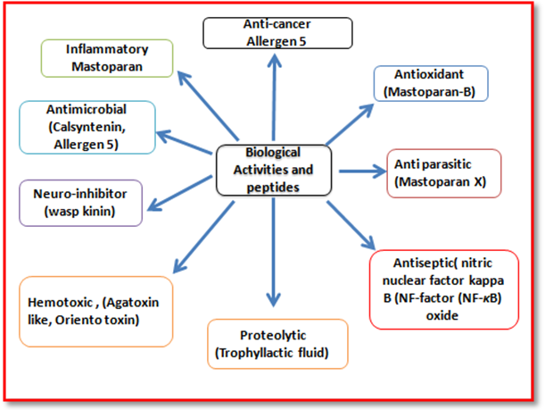 Apitherapy is an alternative therapy in which honey bee products are directly used against honey bees. Apitherapy is used to treat multiple sclerosis, arthritis, infections, and shingles. It is used to treat illnesses wounds, burns, tendonitis as well as pain and acute and chronic injuries. In Apitherapy, honeybee products are applied topically, or intake orally, or provided injection. Apitherapists promote the medical use of products from the beehive (bee venom, propolis, pollen, honey, royal jelly and dead bees. It is also a fact that the majority of patients show un-willingness to apitherapy because they feel that they cannot tolerate such treatments. Therefore, therapeutic modifications are needed for increasing acceptability [158] (table 3; fig. 3). It is true that significant numbers of modern-day pharmaceuticals are derived from natural products, mainly venoms of various origins show therapeutic potentials. In the present time due to the increasing rate of drug resistance of the pathogen organisms and target cells as well as the dependence or tolerance of the body towards the drug, venom toxins are seen novel candidates for making pharmaceutical agents. Wasp venoms are also a rich source of therapeutically important toxins, which includes short cationic peptides, kinins, polyamines and poly DNA viruses. These have diverse therapeutic significance.