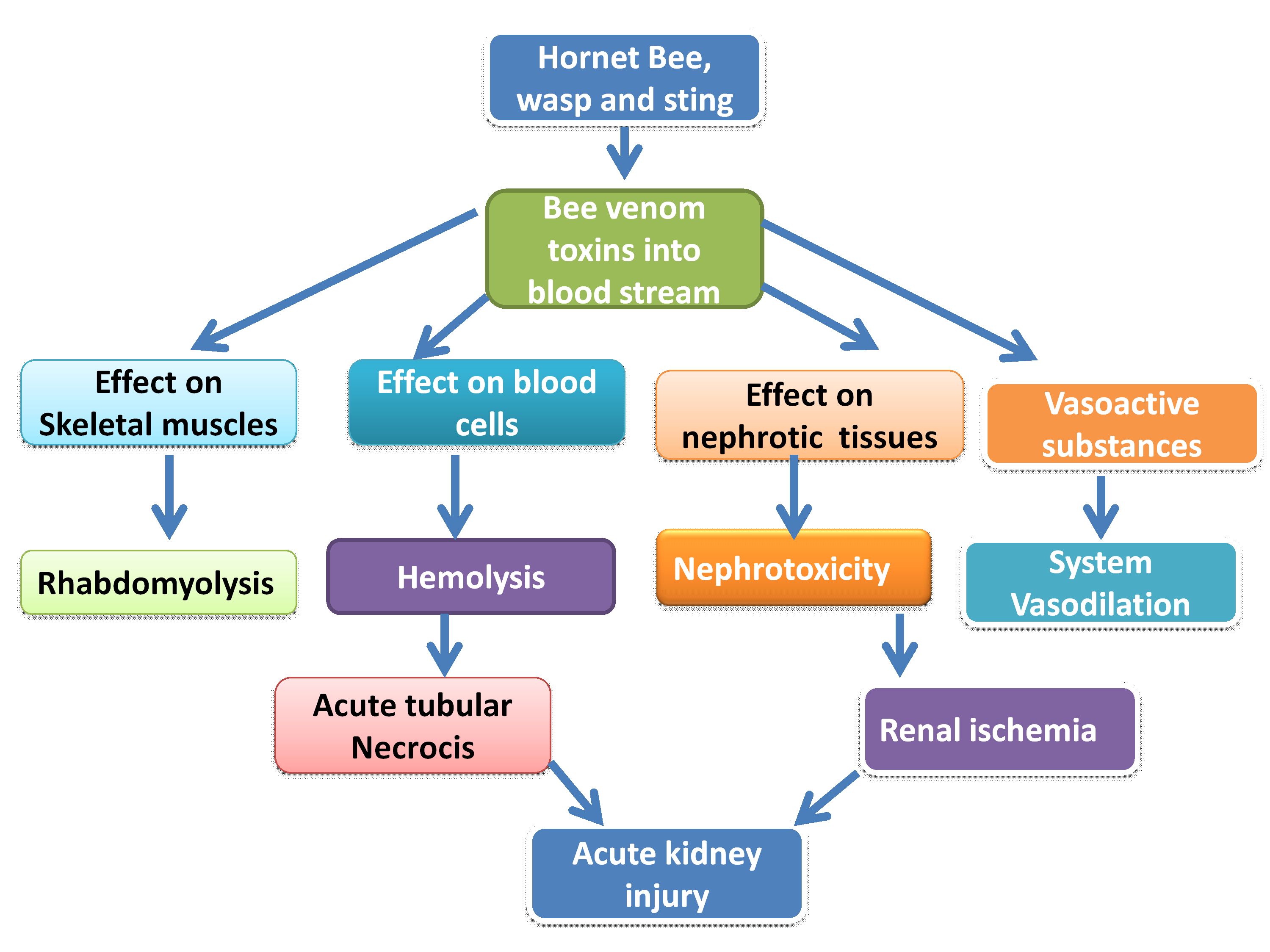 Peptides isolated from bees and wasps i.e. tropomyosin from Orancistro cerus, drewsen, iRhynchium brunneum, paramyosin from Orancistro cerus drewseni, Rhynchium brunneum, myosin from Eumenes pomiformis affect muscle contraction and assembly of contractile machinery in muscle cells (table 3; fig. 3). Chemotactic peptide and mastparan like peptide secreted from Cyphononyx fulvognathus wasp venom showed inflammatory activity due to the presence of kinins and polymanines (table 3; fig. 3). Eumenes pomiformis secrete dendrotoxin that is responsible for K+channel blocking, while Anopliussa mariensis secrete α-pompilidiotoxin, Batozonellus maculifrons β-pompilidiotoxin cause paralysis and block Na+ channels (table 3; fig. 3). Vespa affinis stings cause complications such as myocardial infarction and multiple organ failure. Hornet toxins, increase microvascular permeability and acute pulmonary edema as the primary pathology after envenoming (table 3; fig. 3). Early recognition of acute pulmonary edema in hornet stings is needed more appropriate diagnosis, more often high-quality treatments to avert deaths (table 3).