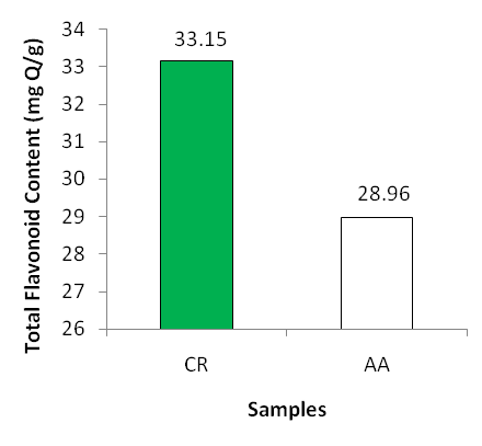 A slightly higher concentration of flavonoid was measured in methanolic fraction of C. roseus than that of A. aspera fraction i.e. 33.15 mg Q/g and 28.96 mg Q/g, respectively.