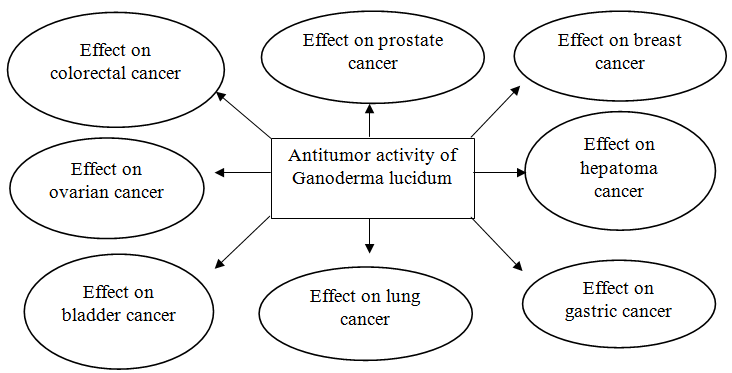 Ganoderma lucidum is generally called “Lingzhi or Reishi”, and also be a Traditional Chinese medicine utilized in over 2000 y for their better therapeutic activity like antitumor, antiallergenic, antiviral, hepatoprotective, antioxidant, hypotensive, immunomodulator, hypoglycemic, anti-inflammatory, antithrombotic, antibacterial and many other health benefits. Ganoderma lucidum is one of the oldest herbal remedy found and grow in wide variety parts on deciduous trees (dead/dying tree) specifically in oak, pyrus, maple, elm, willow, sweetgum, magnolia, locust, acer, betula, castanea, coryolus, fagus, populus, plums and other plants species. It also be contains 400 major bioactive chemical constituents include polysaccharides, triterpenoids, polysaccharide-peptide complex, β-glucans, lectins, natural germanium (Ge), adenosine, phenols, steroids, amino acids, lignin, vitamins, nucleotides or nucleosides possesses specific curative properties and formed a wide variety of viable products from Ganoderma fruiting bodies, mycelia, spores i.e. coffee, powder, dietary enhancements, tea, spore items, drinks, syrups, toothpastes, cleansers or creams. Many in vitro or in vivo analyses with regards Ganoderma lucidum evidenced their antitumor activity but some conducted clinical studies are questionable and remains undefined for their antitumor effect. Though, we reviewed and summarized in this article about treatment and various pharmacological mechanism against tumor with respect to extract (polysaccharide and triterpenoid) of Ganoderma lucidum.