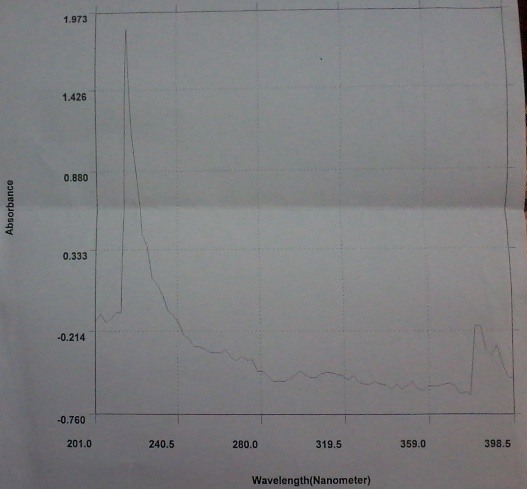 The test sample was scanned for its absorbance maxima using UV spectrophotometer from 400 nm to 200 nm. The λ max was found to be 216 nm. All scans to Artemether were done using this wavelength.