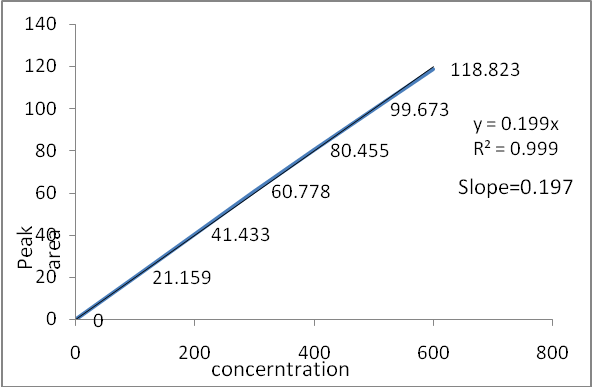 The response was found linear over a concentration range of 100-600 μg/ml of Artemether. The correlation co-efficient were found to be 0.999 for Artemether. So the method is linear, data is presented in Table: 4. Linearity curve of Artemether is given in Fig.5: