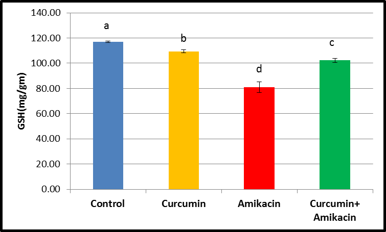 Fig. 1: Effect of oral administration of curcumin at 200 mg/kg body weight for successive 14 d on reduced Glutathione (GSH) concentration in amikacin (300 mg/kg b. wt.) treated rats. (n=6). Data are represented as (mean of 6 rats±S. E) Mean values with different superscriped letters in the same column are significantly different at (P<0.05)