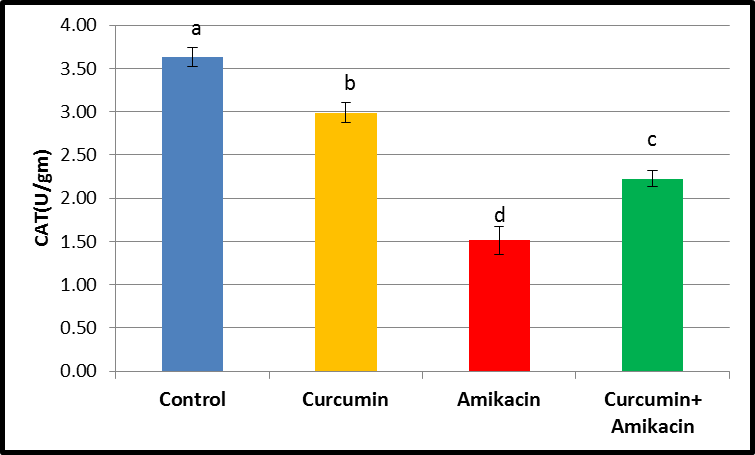 Fig. 2: Effect of oral administration of curcumin at 200 mg/kg body weight for successive 14 d on catalase (CAT) Concentration in amikacin (300 mg/kg b. wt) treated rats. (n=6). Data are represented as (mean of 6 rats±SE). Mean values with different superscripted letters in the same column are significantly different at (P<0.05)