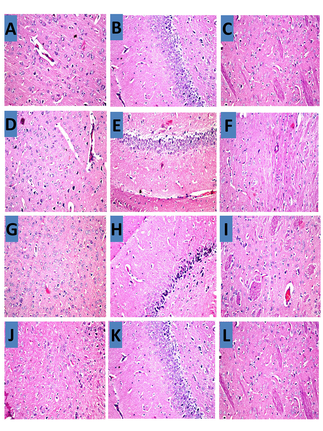 Fig. 3: Histopathological changes in brain tissue (A,B,C) cerebral cortex, hippocampus and striatum of brain of Control group found no histopathological ulteration, (D,E,F), cerebral cortex, hippocampus and striatum of brain of Curcumin treated group also found no histopathological ulteration, (G), cerebral cortex of brain of amikacin treated group also found no histopathological ulteration, (H) hippocampus of brain of amikacin treated group, nuclear pyknosis and degeneration were detected in some neurons, (I) multiple focal eosinophilic plagues formation were detected in striatum of brain of amikacin treated group, (J) cerebral cortex of concurrent group (Amikacin and curcumin) no histopathological alteration was detected, (K) some nuclear pyknosis and degeneration were detected in some neurons hippocampus of concurrent group (Amikacin and curcumin), (L), no histopathological alteration recorded in the striatum of the concurrent group (Amikacin and curcumin) immunohistochemistry