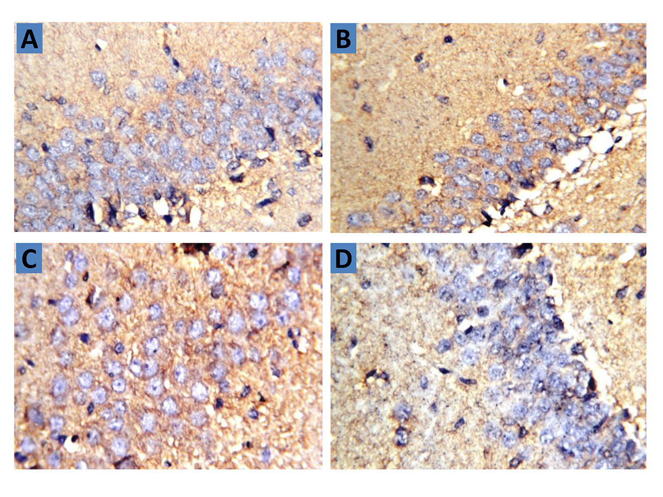 The immunohistochemical finding of Caspase 3, in brain tissue. Showed a change in caspase 3 expression after treatment with curcumin, amikacin, and curcumin with amikacin. The reaction in the brain is localized in the neuron. Immunostaining was performed using anti caspase 3. The severity of the immunohistochemical reaction is depending on the density and distribution of dark brown coloration. Mild expression (+) was found in the amikacin group for caspase 3, while Nil expression (-) was found in other groups, table 3, fig. 4 (A, B, C, D).