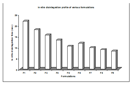 The results of In vitro disintegration were within the prescribed limit and comply with the criteria for orally disintegrating tablets. The values were in the range of 8.3 - 21.9 sec. The rapid disintegration was seen in the formulation containing sodium starch glycolate followed by crospovidone and then Crosscarmellose sodium. It was also noticed that as the disintegrant concentration increased from 2.5 to 7.5%, the time taken for disintegration was reduced. Formulations containing crospovidone as superdisintegrant in which the disintegration time was reduced upon increasing the concentration up to 5% only and further increase in crospovidone concentration will increase the disintegration time was exception from the above rule. Effect of superdisintegrant concentration at a disintegration time is shown in fig. (1).