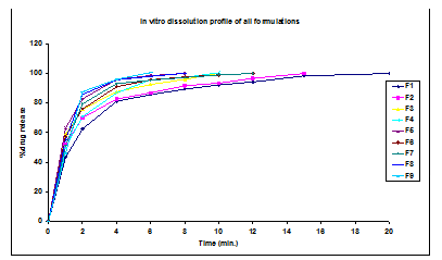 All the nine formulations of Meloxicam ODTs were subjected to In-vitro dissolution studies by using phosphate buffer pH 7.4 as dissolution medium. In-vitro release studies of all nine formulations were plotted and shown in the fig. (2).