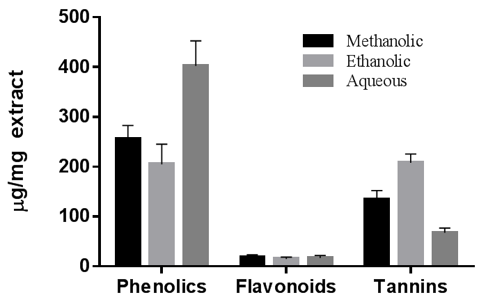 Determination of the total phenolic content was performed as previously described [19]. Extracts were used in concentration from 0.025 to 0.250 mg/ml. Gallic acid, prepared in varied concentrations ranging from 0.005 to 0.050 mg/ml was used as a standard. The total phenolic compound concentration in the extracts was expressed as micrograms of gallic acid equivalent per mg (µg GAE/mg) of extract.