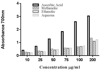Out of three extracts, the methanolic extract exerted the highest reductive capacity with an absorbance of 1.34 at 200 µg /ml followed by aqueous and ethanolic extracts. Also, the reducing ability of each extract was concentration dependent and comparable to that of the control ascorbic acid with an absorbance of 1.2743 at 50 µg /ml and the EC50 value of 18.884.