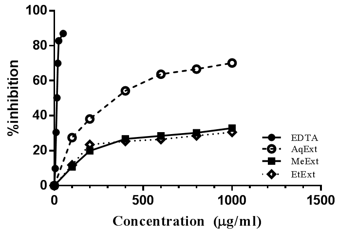 Metal chelating activity is significant since it reduces the concentration of the catalyzing transition metal in lipid peroxidation. Fig. [ 3] shows concentration dependent chelating effect of the extracts from S. glauca on the Fe2+ - ferrozine complex. The aqueous extract displayed the highest chelating activity [IC50 332.690 µg/ml], whereas methanolic and ethanolic extracts showed a relatively moderate chelating activity, with higher concentration resulting in precipitation indicating interference of other components inhibiting pronounced chelating activity. Chelating agents may serve as secondary antioxidants because they reduce the redox potential, thereby stabilizing the oxidized form of the metal ion. Accordingly, it is suggested that the low to moderate ferrous ion chelating effect of these extracts would be somewhat beneficial to protect against oxidation damage.