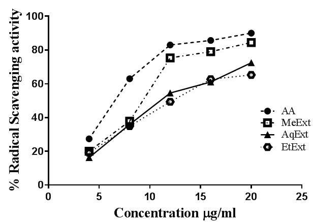 Fig. 4: DPPH scavenging effect of S. glauca extracts. (AA-Ascorbic acid, MeExt-Methanolic extract, EtExt-Ethanolic extract, AqExt-Aqueous extract) (n=3)