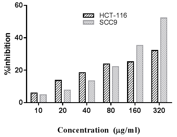 The cytotoxic assay detects the reduction of MTT (3-[4, 5- dimethylthiazol-2-yl]-2, 5-diphenyl tetrazolium bromide) by mitochondrial dehydrogenase to blue insoluble formazan product, which reflects the normal functioning of mitochondria and hence the cell viability. Briefly 5.0 X 104 cells of SCC9, MCF-7, A549 and HCT116 were plated in triplicate in 96 well plates with RPMI-1640 without FBS or DMEM and incubated for 24 hrs at 37oC. Plant extracts were tested at 0-320 µg/ml in serum free RPMI media and incubated for 24 hr in CO2 incubator at 37°C. After incubation with plant extracts, the media was removed from the wells and added a 100 µl/well of the MTT reagent (0.5mg /ml in PBS) and incubated for 3-4 hrs. After incubation, the supernatant was then aspirated, and 100 μL of dimethyl sulfoxide was added to the wells, to dissolve the colored formazan crystals produced from the reaction of cells with MTT. Plant extracts treated cells were compared to untreated cell control wells (DMSO as vehicle control). The optical density values were measured using a Tecan microplate reader at a wavelength of 590 nm. The percentage inhibition was determined using the formula.