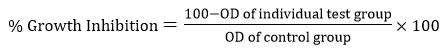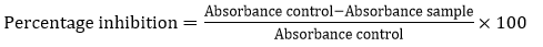 Aluminium chloride colorimetric method was used to determine the total content of flavonoids [ 19]. Test samples were prepared in concentrations of 25.0 to 250 μg /ml, while quercetin solutions were prepared ranging from 10 to 100 μg/ml and used as a standard. The total flavonoid content was expressed in µg of quercetin equivalent (QE) per mg of extract.