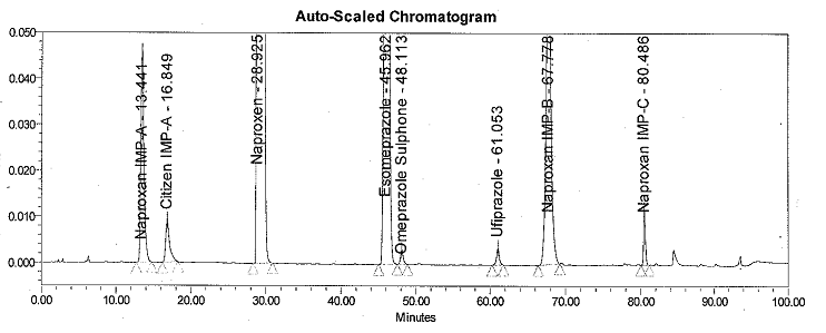The aim of method validation was to confirm that the present method was suitable for its intended purpose as described in ICH guidelines [15]. The described method has been widely validated in terms of specificity, precision, linearity, accuracy and Limit of Quantification. Specificity of the method was evaluated by injecting individual impurities and by subjecting the drug in to force stress conditions. The precision of the method was expressed in term of coefficient of variation for % of impurities. The accuracy was expressed in terms of percent recovery of the known amount of impurities added to the sample preparation. To perform the validation activity Naproxen impurity A, Naproxen impurity B and Naproxen impurity C of Naproxen, and Citizen impurity A, Omeprazole sulfone and Ufiprazole were selected.