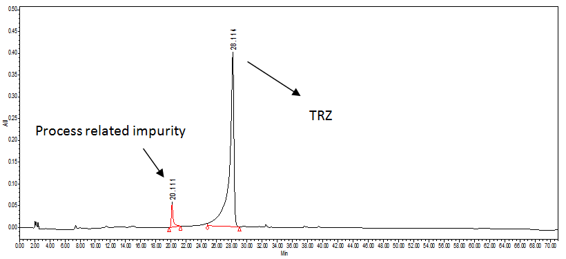 Conclusion: The complete Impurity profiling for TRZ is reported for the first time in literature. The study data would be add-on for formulation storage condition and further development.