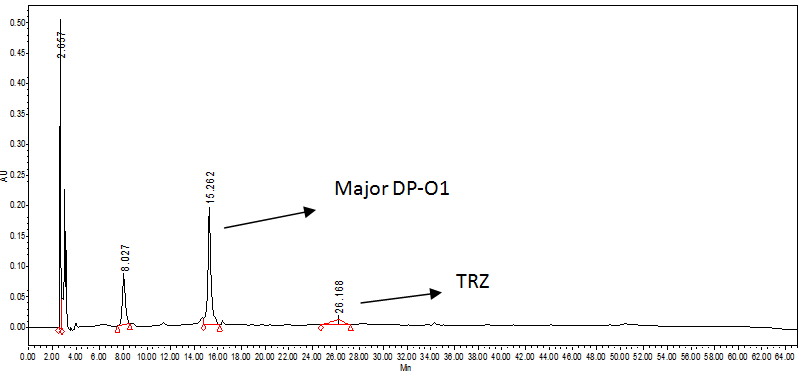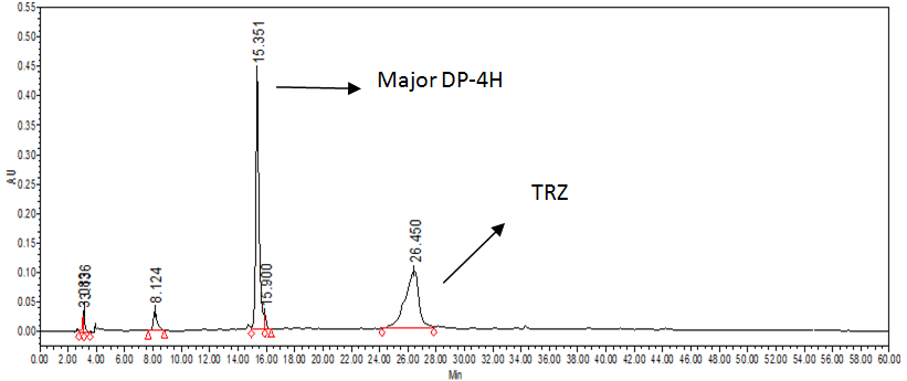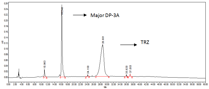 The extensive literature survey shows several reported methods which are; UV method [4], HPLC method for TRZ in plasma [5], stability study for TRZ [6] (degradation products were not separated nor reported), the two degradation products of TRZ are reported by HPTLC and MS/MS method [7] (the DPs are marked with an asterisk in paper and cited which are reported in literature), HPTLC and LC/MS/MS methods are reported [8]. None of the reported literature investigates the entire impurity profile for TRZ, therefore it was an opportunity and challenge to study stress degradation and report the impurity profile of TRZ. In this study, the novel DPs and process-related impurities are extensively studied and reported in the literature for the first time. The objective of the study was to study stress degradation and prepare an impurity profile of TRZ.