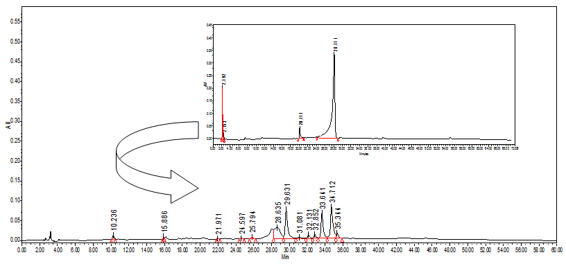 Several fractions were formed in alkaline condition after degradation of TRZ and ESI/MS spectrum showed several peaks for fractions. It was not possible to report all of them and there was no intense or major peak that can be considered as major or reportable. The pattern for degradation of TRZ in alkaline condition was in 0.5N NaOH at RT, TRZ peak appeared for 35 min after 35 min the fractions shown in fig. 2 were observed, for lower concentration the degradation time point was extended but the same chromatogram was obtained.