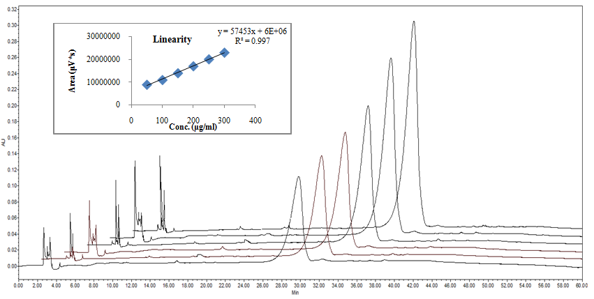 The stability-indicating method was validated as per ICH Q2 (R1) guidelines [9] in terms of linearity, range, precision and recovery. The good linearity was observed for the range (50-300μg/ml) of TRZ with a correlation coefficient of 0.997. RSD (relative Standard deviation) for linearity, precision and recovery study was<2.0% indicates that a precise and reproducible method was developed. The recovery for the study was in the range of 98.4-100.5% indicates that good recovery was obtained. The assay result showed that 99.5% recovery of the formulation was observed. The validation results are shown in table 2. The overlay of different concentrations of TRZ solution for linearity is shown in fig. 3.