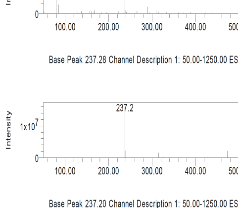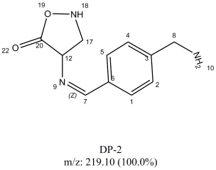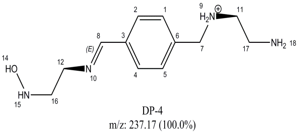 DP-4H is a major DP with m/z of 237.0; identification and characterization is described in details in the previous section. The DP-4H is formed due to the cleavage of five-member rings. Amine groups of five member ring remains attached while alcohol and ketone group is removed due to acid effect. The alcohol group remains attached to the amine in one of the side and it was confirmed by proton NMR spectrum analysis [11].