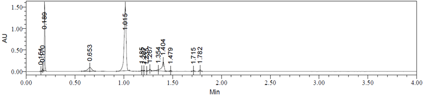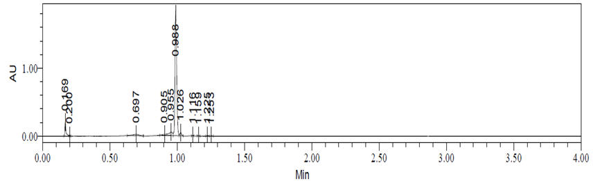UPLC/ESI-MS study was carried out using mobile phase a) 0.1 % formic acid in Milli Q water (pH= 2.70) and b) 0.1% formic acid in Milli Q water: acetonitrile (10:90). Gradient elution program was set to T/(%A) = 0 min (97%) flow: 0.8 ml/min; 0.75 min (97%); 2.7 min (2%); 3 min (0%); 3.5 min (0%); 3.51 min (97%); end of run at 4 min (97%), Flow rate: 1 ml/min, analysis time 4 min.