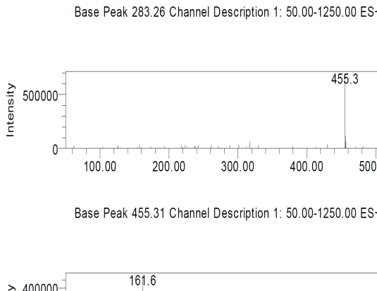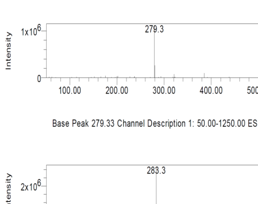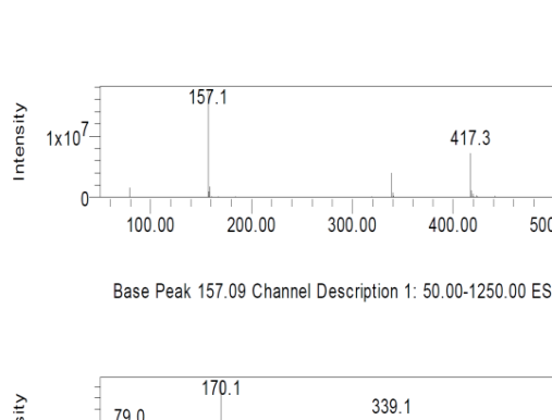 The peaks in fig. 5 are showing broadening and tailing, as high concentration sample was used for analysis to detect the very low responses in ESI/MS. The ESI-MS spectrum showed seven DPs, among which one was major DP (4H) and other DPs were eluted at Rt 0.198, 0.669, 0.981, 1.204, 1.278 1.495 and 1.863. The name of the DPs are mentioned in the increasing order of m/z for DPs; DP-1H (m/z 417 Rt, 0.198), DP-2H(m/z 161 co-elution with m/z 116 Impurity-1, Rt, 1.863), DP-3H(m/z 170 Rt,0.664), DP-4H (m/z 237.2,Rt,0.956,0.981, 1.029), DP-5H(m/z 279, Rt, 1.204), DP-6H(m/z 283, Rt, 1.278)(reported in literature [8]) and DP-7H(m/z 455, Rt, 1.495). The data is gathered in table 4 with the proposed structure.