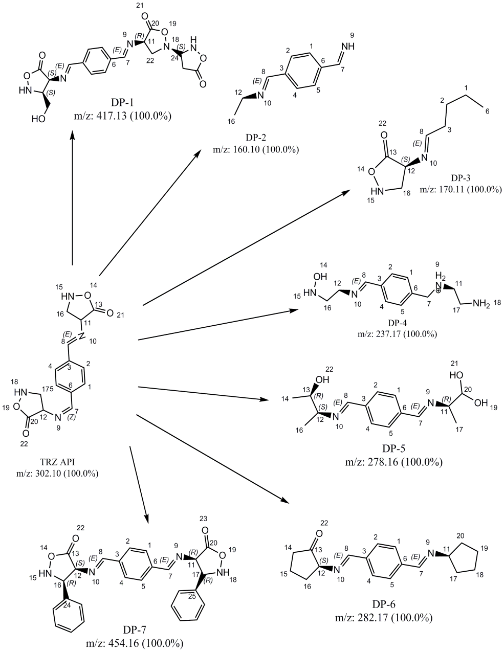 The DP-7H is formed due to the attachment of benzene rings at attachment sites in TRZ chemical structure. The benzene ring is the fraction of TRZ chemical structure which is ruptured in acid media.