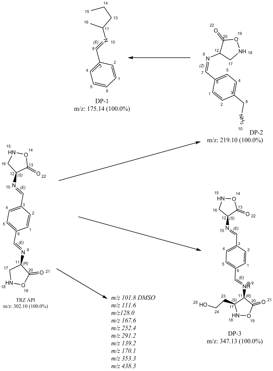 The stability study for TRZ was performed and it was observed that TRZ degraded in acid, neutral, alkaline and oxidative medium while stable under UV and thermal conditions. TRZ was highly sensitive for alkaline media. The major DPs were isolated, identified and characterized using different sophisticated instruments. While minor DPs present in sufficient quantity to fall in the category of classification of identification of impurity was identified using ESI/MS spectrum. The process-related impurity and other degradation impurities are reported for the first time. The study results are handy material for suggested storage conditions and improvement in formulation development.
