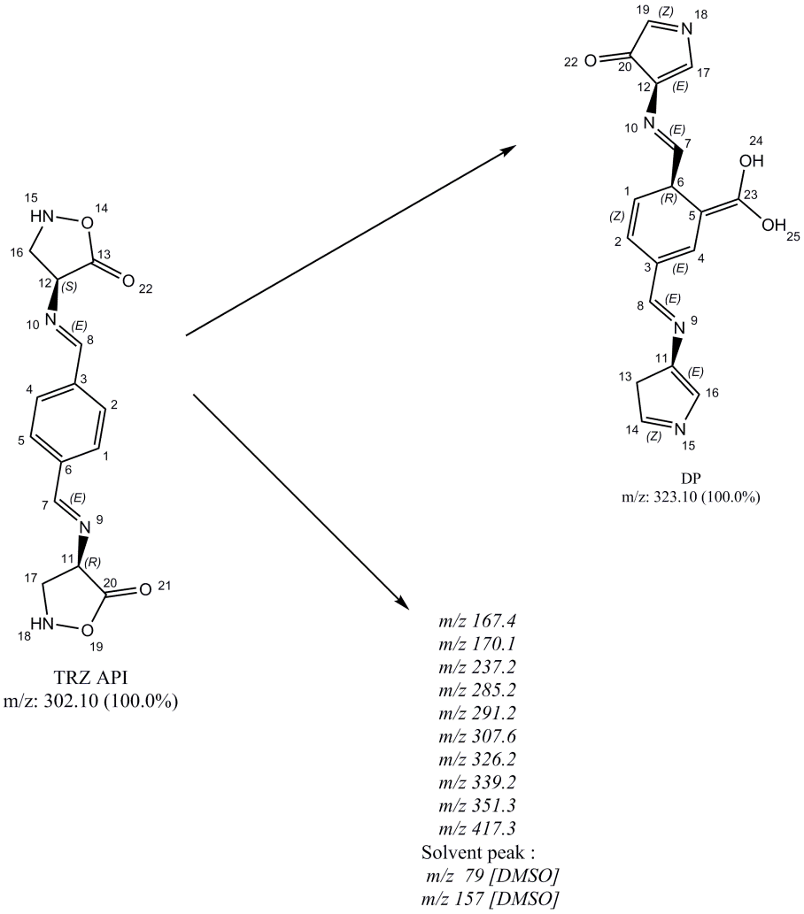 The major DP with m/z 323.1 suggests the oxidation of TRZ. The oxidation in presence of oxidizing agent was occurred at position 22 and 17 in TRZ chemical structure. The conjugation or/and fragmentation of TRZ formed other minor DPs. The Oxide DP (O1) is named as (4S, 5S)-5-hydroperoxy-N-((E)-4-((E)-(((R)-5-oxo-1,3,2-dioxazolidin-4-yl)imino)methyl)benzylidine)isoxazolidin-4-aminium that matches with chemical formula C13H15N4O6.